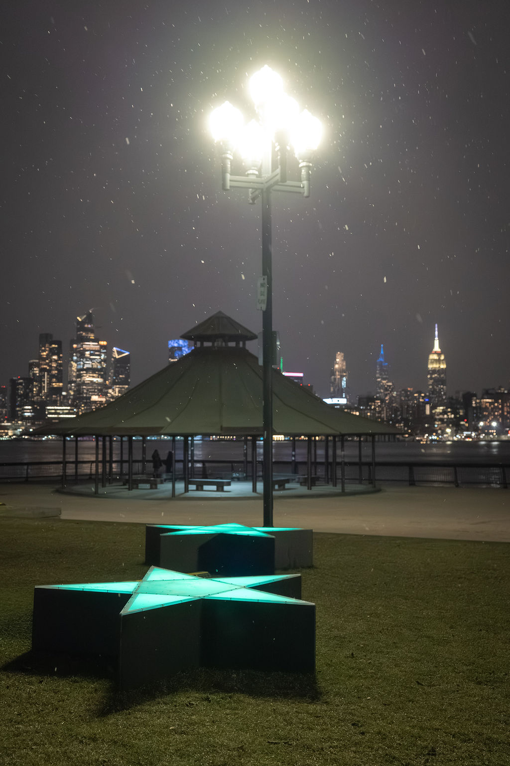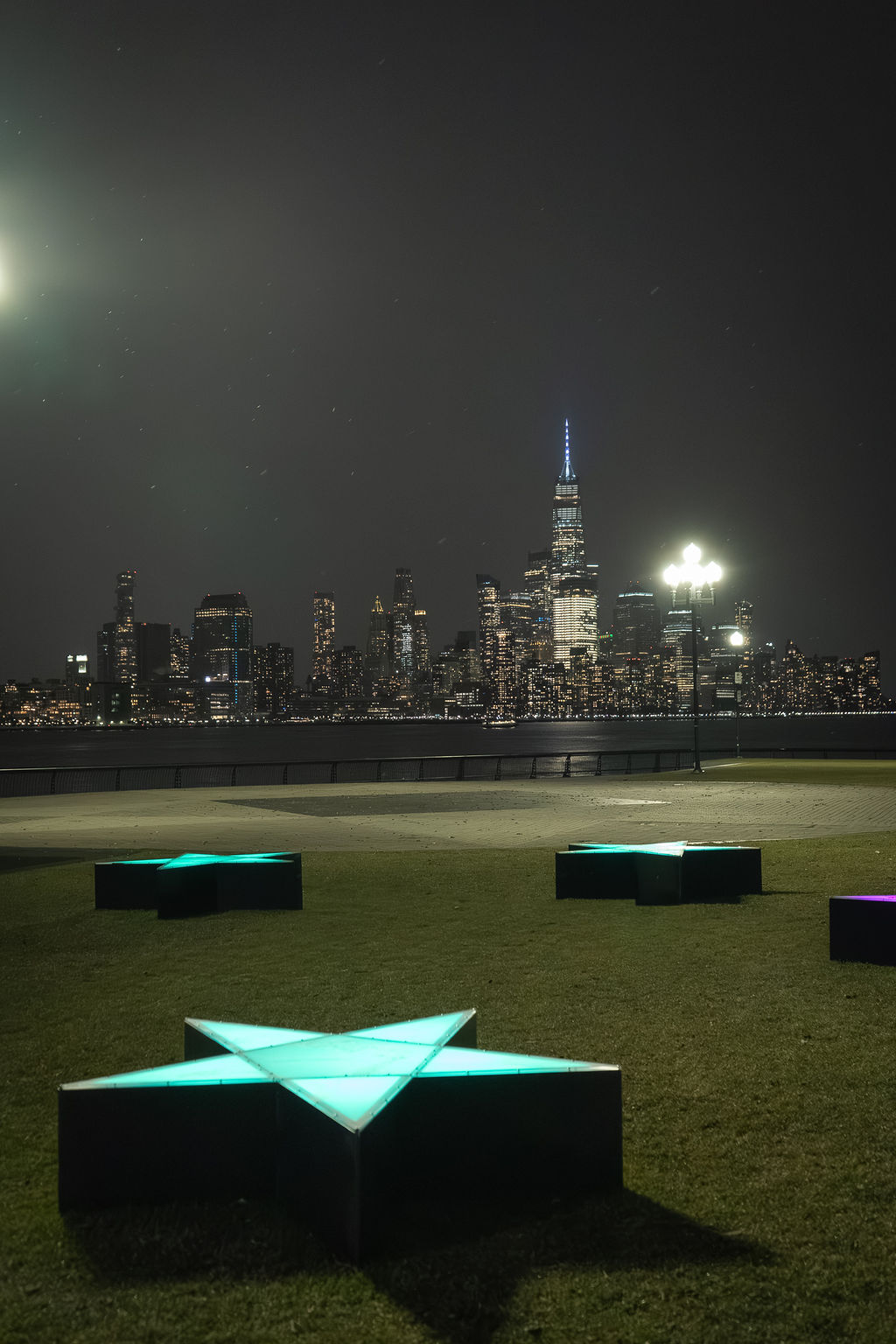 The Hoboken Business Alliance partnered with LeMonde Studio over the course of a year Hoboken will display four different LeMonde Studio installations . Beginning with “Star Light” a temporary installation that consists of 5 glowing stars. The public is invited to interact with the sculpture to pause and enjoy the festive glow of the stars while enjoying the spectacular Hudson River Views. Star Light invites contemplation, gratitude, and a chance to enjoy the light of the season.